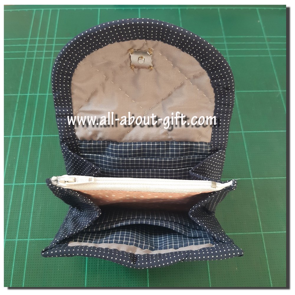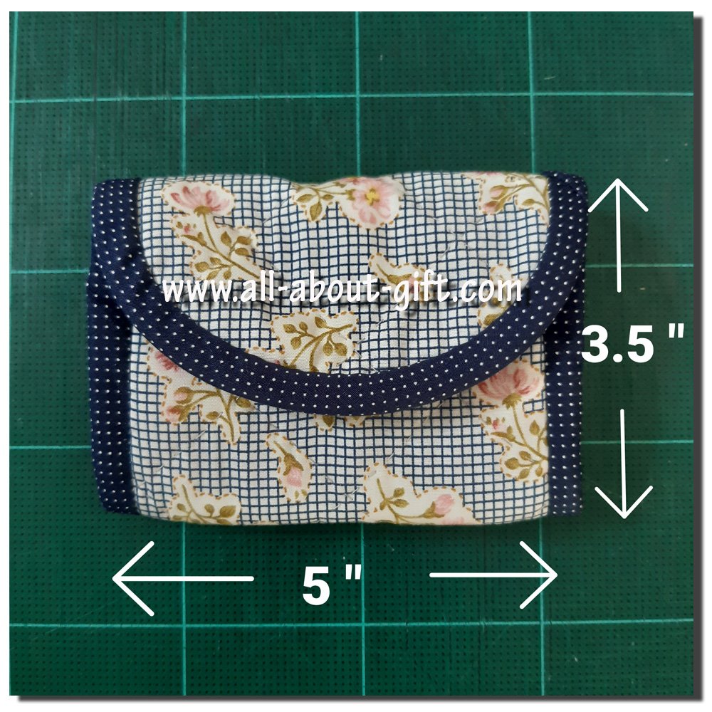 กระเป๋าเงินทรงหีบเพลง แบบสั้น เป็นผ้าคอตตอนไทยลายดอกไม้สีชมพู บนพื้นขาว ลายตารางสีกรมท่า บุใยสังเคราห์ กุ๊นด้วยผ้าคอตตอนสีกรมท่าลายจุด ควิลท์และประกอบด้วยมือทั้งใบ