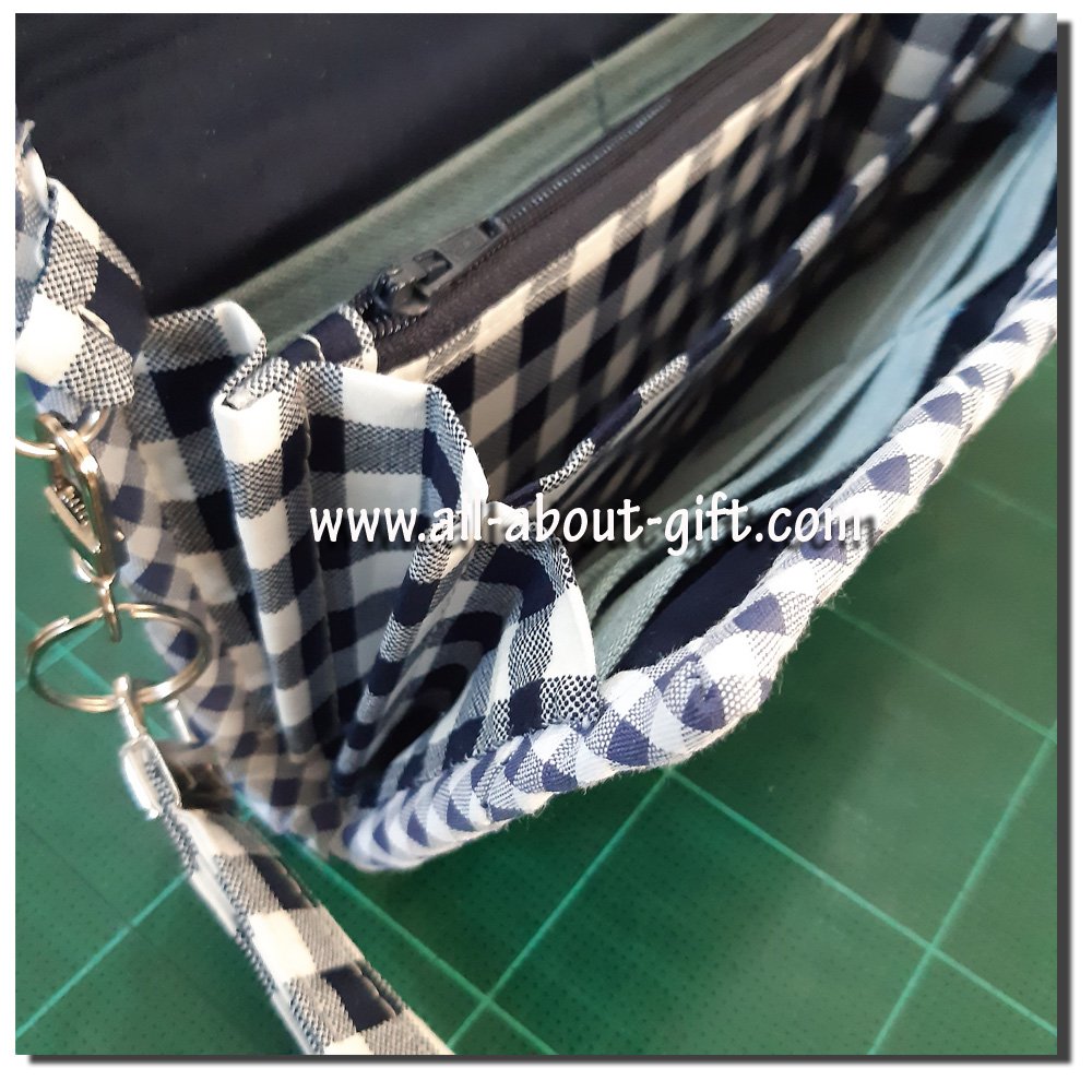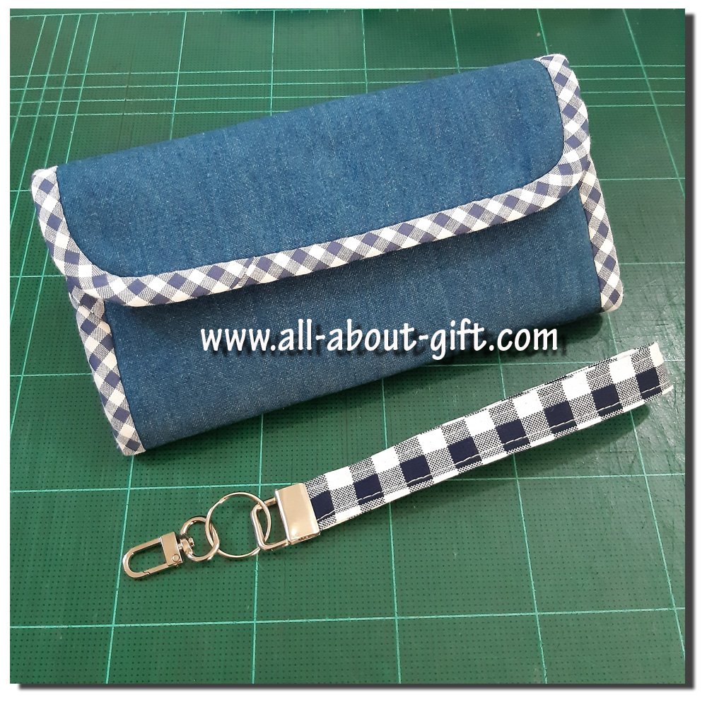 บุใยสังเคราะห์ ด้านในช่องบัตรเป็นผ้ายีนส์ฟอกสีอ่อน ใส่บัตรได้ 12 ใบ ช่องซิป 1 ช่อง ช่องแบ่งธนบัตร ทำจากผ้าคอตตอนไทย ลายตารางสีกรมท่า