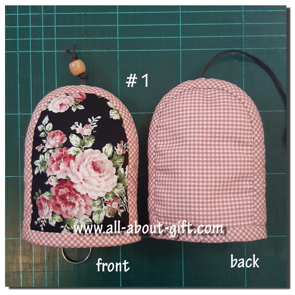 ผ้าด้านหลังใช้ผ้าคอตตอนไทยลายตารางเล็กๆสีชมพู บุใยสังเคราะห์ กุ๊นโดยรอบด้วยผ้าลายเดียวกัน ทำให้เป็นที่ครอบกุญแจที่วางแนวตั้งฉากกับพื้นได้ ปลายเชือกเป็นลูกปัดไม้